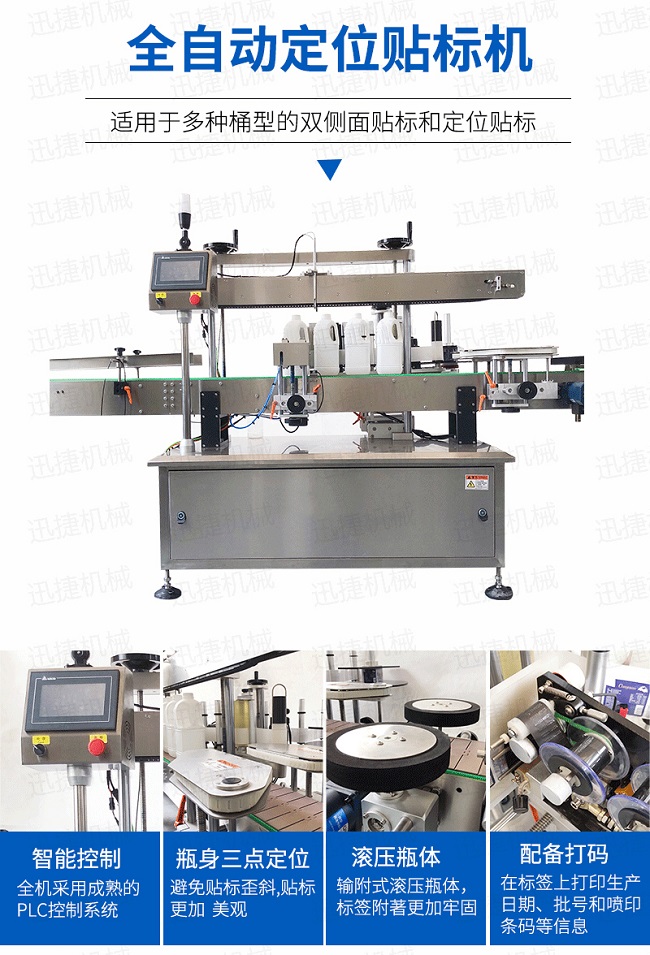 全機采用微電腦-PLC-電子光纖傳感器控制系統,使整機運行穩定、高速操作系統采用操作界面控制,操作簡便、實用、效率高,并有產量記數功的速度快且穩定適用范圍大,可用于各種尺寸的圓形瓶貼標輸附式滾壓瓶體,使標簽附著更加牢固前后段可選連線使用。